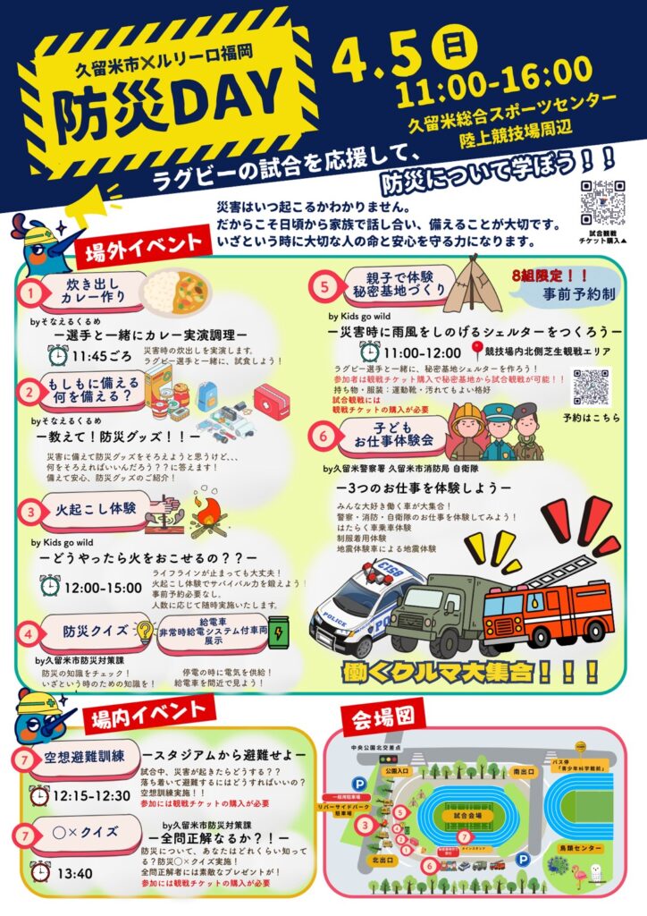 ◯久留米市×ルリーロ福岡 防災DAYに参加しました(R8.4.5) Uncategorized 2026.04.08 2026.04.05 4月5日(日)久留米総合スポーツセンター陸上競技場周辺にて行われた久留米市×ルリーロ福岡 防災DAYのイベントに参加してきました。 ラグビーの試合の応援を通して、秘密基地作りや火おこし体験、災害ボランティア体験など、さまざまな防災体験ができるイベントで、ラグビーの試合会場では「試合中に災害が起きたら…」を想定した空想避難訓練を行ないました。 地震が起きた際の行動のとりかたや避難経路の確認など、身近な関心から防災に繋げることができるイベントとなりました。